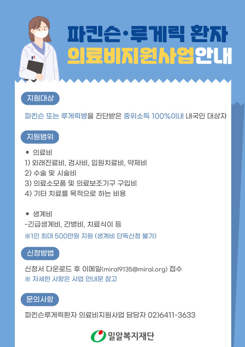 [마감] 파킨슨루게릭 환자 의료비지원사업 대상자 모집 안내 2025.09.02 |