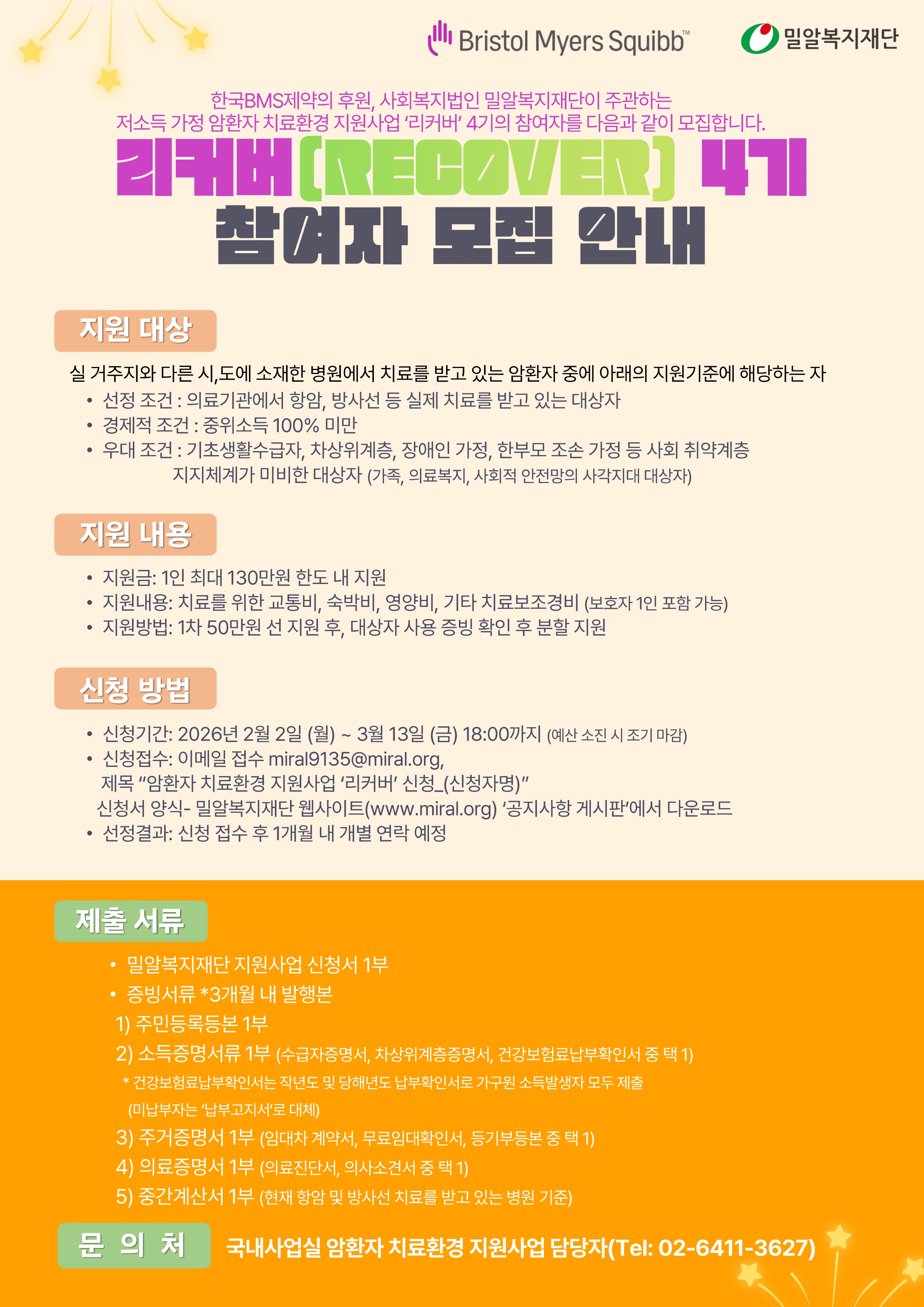 한국BMS제약과 함께하는 암환자 치료환경 지원사업 리커버 4기 대상자 모집 2026.01.26 |