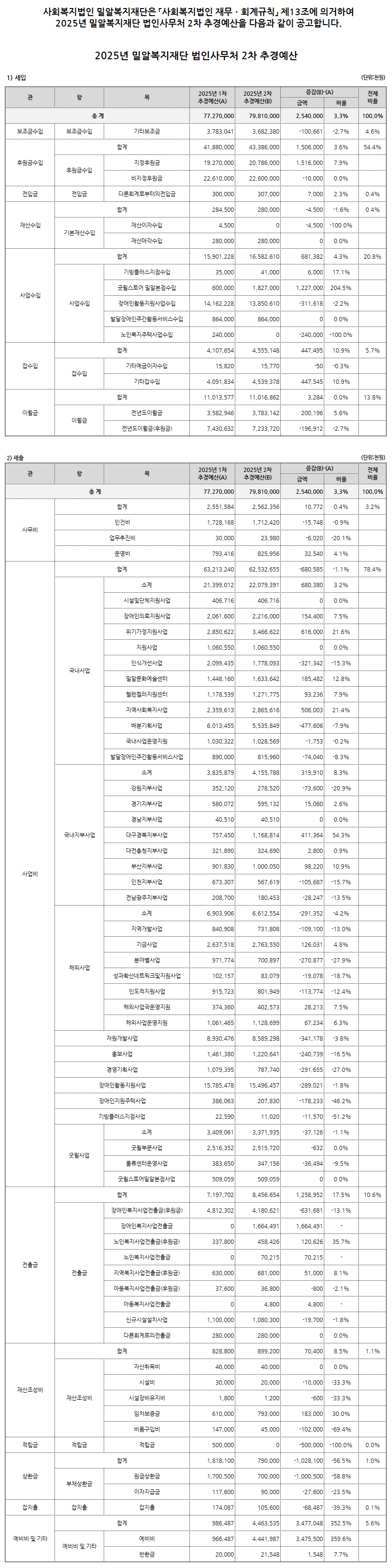2025년 밀알복지재단 법인사무처 2차 추가경정예산 공고
