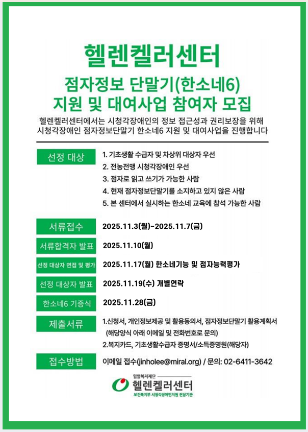 ![]() 보건복지부 시청각장애인 지원 전담기관 헬렌켈러센터에서는 시청각장애인의 정보접근 향상을 위해 점자정보단말기(한소네6) 지원 및 대여사업을 진행하오니 참여자 추천 및 홍보를 요청드립니다. 1. 사업명 : 점자정보단말기(한소네6) 지원 및 대여 2. 모집대상 : 시청각장애인 3. 신청기간 : 2025.11.03.(월)~2025.11.07(월) 4. 접수방법 : 이메일 접수(jinholee@miral.org) / 문의:02-6411-3642 5. 선정절차 : 1차 서류접수(~11.07)→2차 면접 및 평가(11.17)→최종 대상자 발표(11.19)→기증식(11.28) 6. 제출서류 : 1. 신청서, 개인정보제공 및 활용동의서, 점자정보단말기 활용계획서 (해당양식 이메일 및 전화번호로 문의) 2. 복지카드, 기초생활수급자 증명서/소득증명원(해당자) 7. 선정대상 : 1. 기초생활 수급자 및 차상위 대상자 우선 2. 전농전맹 시청각장애인 우선 3. 점자로 읽고 쓰기가 가능한 사람 4. 현재 점자정보단말기를 소지하고 있지 않은 사람 5. 본 센터에서 실시하는 한소네 교육에 참석 가능한 사람 |