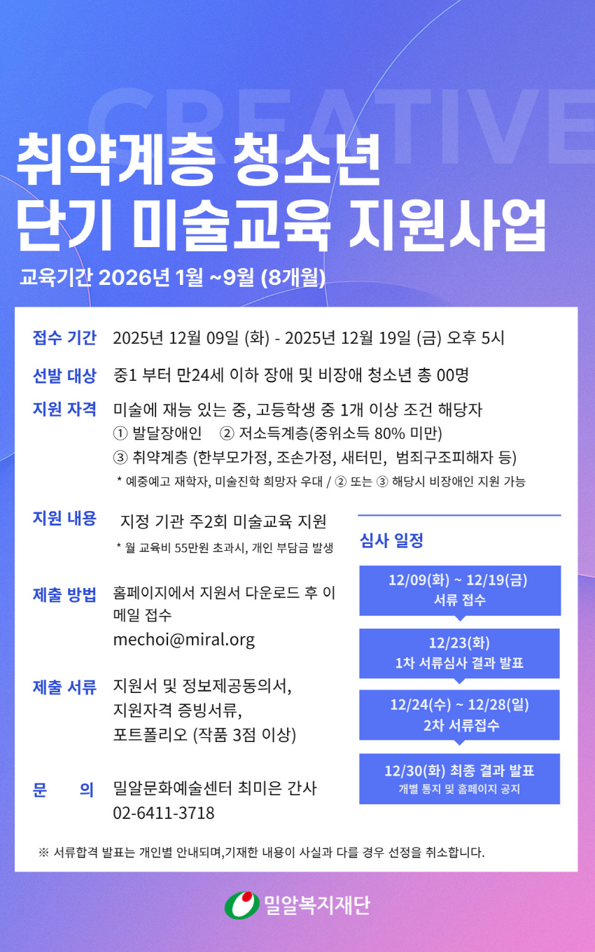 [취약계층 청소년 단기 미술교육 프로그램] 모집 기간: 2025.12.09.(화) ~ 12.19.(금) 1. 선발대상: 2. 지원자격: 2-1. 발달장애인 2-2. 저소득계층 (중위소득 80% 미만 / 비장애 지원 가능) 2-3. 취약계층 (한부모가족, 조손가정, 새터민, 범죄구조피해자 등 / 비장애 지원 가능 ) [가점사항] - 예중, 예고 재학 또는 미대 진학 희망자 3. 지원내용: 4. 심사일정 - 1차 서류접수: 2025년 12월 09일(화) ~ 2025년 12월 19일(금) 17:00까지 - 1차 서류심사(지원서): 12월 23일(화) (합격자에 한해 개별통지) - 2차 서류제출(자기성장스토리): 12월 24일(수)~12월 28(일) (1차 심사 합격자 한해 실시, A4 1매 지정양식) - 최종 결과발표: 12월 30일(화) (합격자에 한해 개별통지 및 홈페이지 공지) 5. 서류제출 5-1. 제출방법: 첨부파일 다운로드 후 신청서 작성 → 이메일 접수 (mechoi@miral.org) 5-2. 제출제목: [사업명][지원자명] 서류 접수 ex) 취약계층단기 김밀알 서류 접수 5-3. 지원서 및 정보제공동의서: 홈페이지에서 양식 다운로드하여 작성 5-4. 지원자격 증빙서류 - 발달장애인 해당자: 복지카드 또는 장애인증명서 - 저소득계층 해당자: 수급자확인서, 차상위계층 확인서, 보호자의 건강보험자격확인서 중 택1 - 기타 취약계층 증빙서류 5-5. 포트폴리오: 3점 이상 작품 이미지 첨부 6. 문의: 밀알복지재단 밀알문화예술센터 최미은 간사(02-6411-3718) ※ 기재한 내용이 사실과 다를 경우 선정을 취소합니다. |