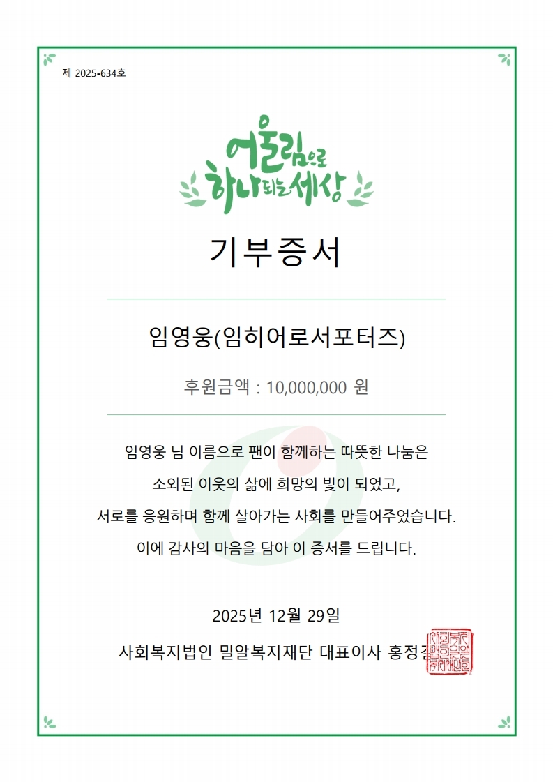 [보도자료] 임영웅 팬클럽 ‘임히어로서포터즈’ 연말 나눔 동참... 밀알복지재단에 1,000만원 기부 2025.12.29 |