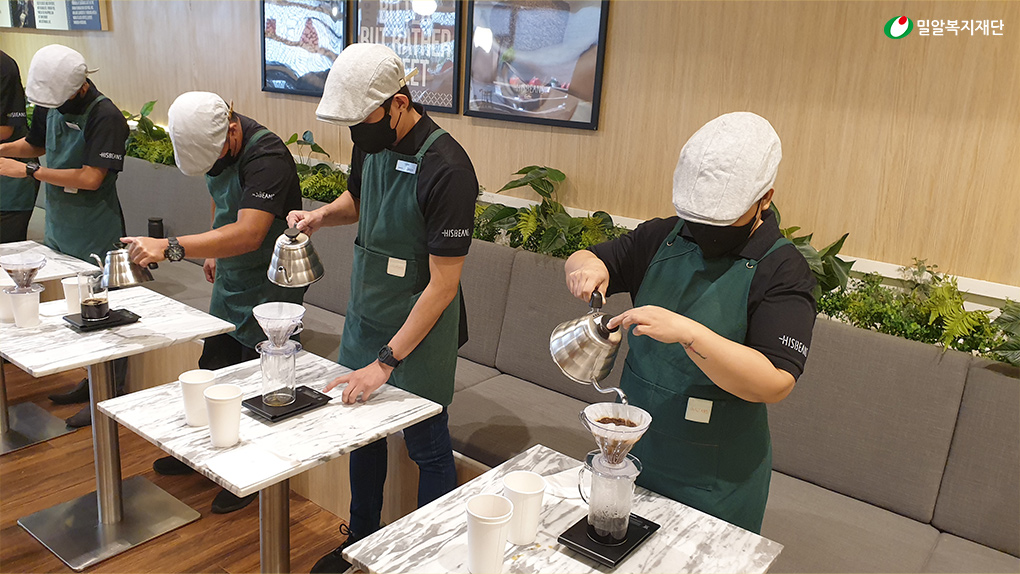이에 밀알복지재단은 ㈜향기내는사람들, 한국국제협력단(KOICA)와 함께 사회적 연대경제 모델을 기반으로 2019년부터 히즈빈스 1호점을 기획했고, 어려운 팬데믹 시기를 지나 2021년 7월 30일 필리핀 퀘존에 정식 개점했습니다. 그 결과 2025년 7월, 히즈빈스 카페는 어느덧 개점 4주년을 맞이하며, 지역사회 속 희망의 공간으로 자리매김하였습니다. ![]() ‘히즈빈스 퀘존 1호점’ 내부 장애인과 비장애인이 ‘한 팀’이