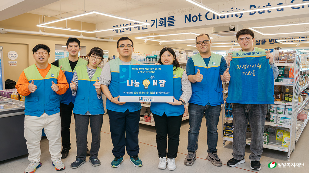 ![]() 또한 학령기의 장애아동들에게 교육의 기회를 보장하고자 특수학교인 밀알학교 운영을 비롯해 다양한 교육지원사업을 펼치고 있습니다.; 발달장애 아동·청소년 미술교육 지원사업 ‘봄(Seeing&Spring) 프로젝트’, 음악교육 지원사업 ‘날개’ 등을 통해 장애아동이 각자가 가진 재능을 발휘할 수 있도록 돕고 있습니다. ![]() 지난 9월 개최된 봄(Seeing&Spring) 전시회 현장 2. 굿윌스토어: 일자리로 만드는 경제적 자립 "장애인에게 필요한 건 자선이 아닌 기회입니다." 밀알복지재단의 굿윌스토어는 시민들로부터 기증받은 물품을 재판매하여 장애인들에게 소중한 일자리를 제공하는 사업장입니다. 장애인들은 이곳에서 기증품을 수거하고, 분류, 판매하는 등의 일을 통해 월급을 받고 경제 활동에 참여합니다.; 이처럼 굿윌스토어는 장애인을 '보호받아야 할 대상'이 아닌 '사회의 당당한 일원’으로 자리매김할 수 있도록 돕고 있습니다.